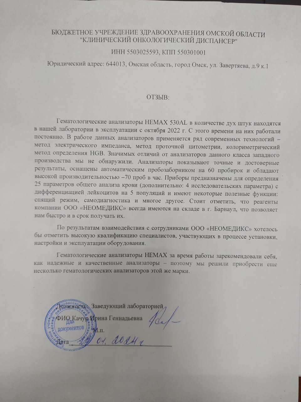 По результатам взаимодействия с сотрудниками ООО «НЕОМЕДИКС» хотелось бы отметить высокую квалификацию специалистов, участвующих в процессе установки, настройки и эксплуатации оборудования.