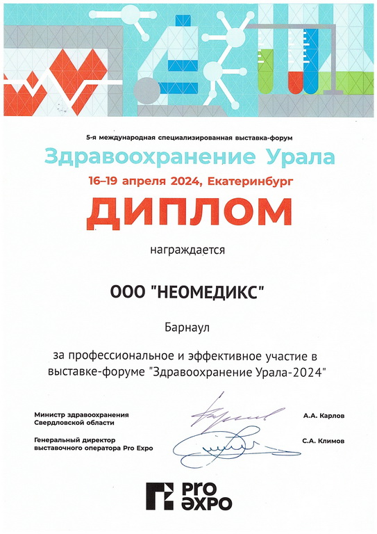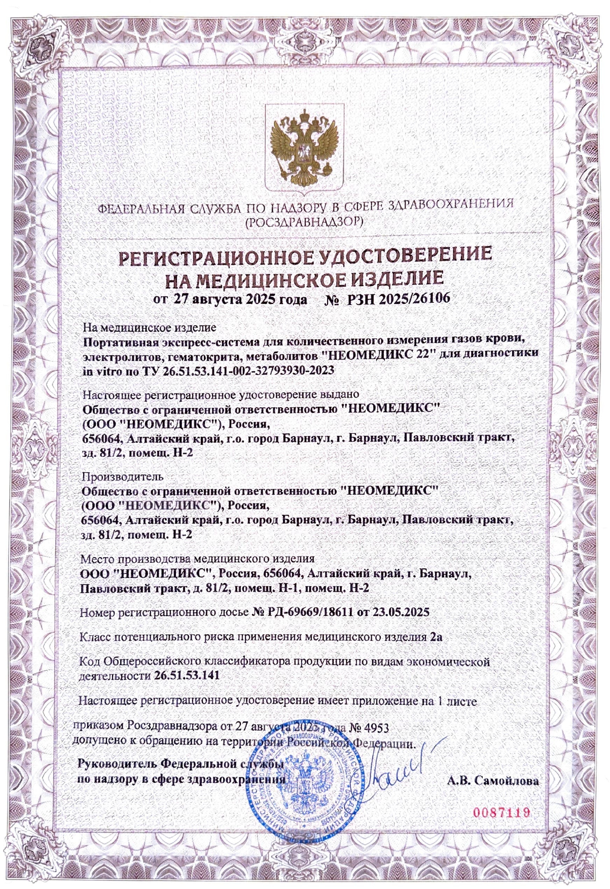 В августе 2025 года было получено регистрационное удостоверение на портативную экспресс-систему для количественноо измерения газов крови, электролитов, гематокрита, метаболитов "НЕОМЕДИКС 22" для диагностики in vitro по ТУ 26.51.53.141-002-327939-30-2023, производства ООО "НЕОМЕДИКС" (РУ №РЗН 2025/26106 от 27.08.2025 г.)
