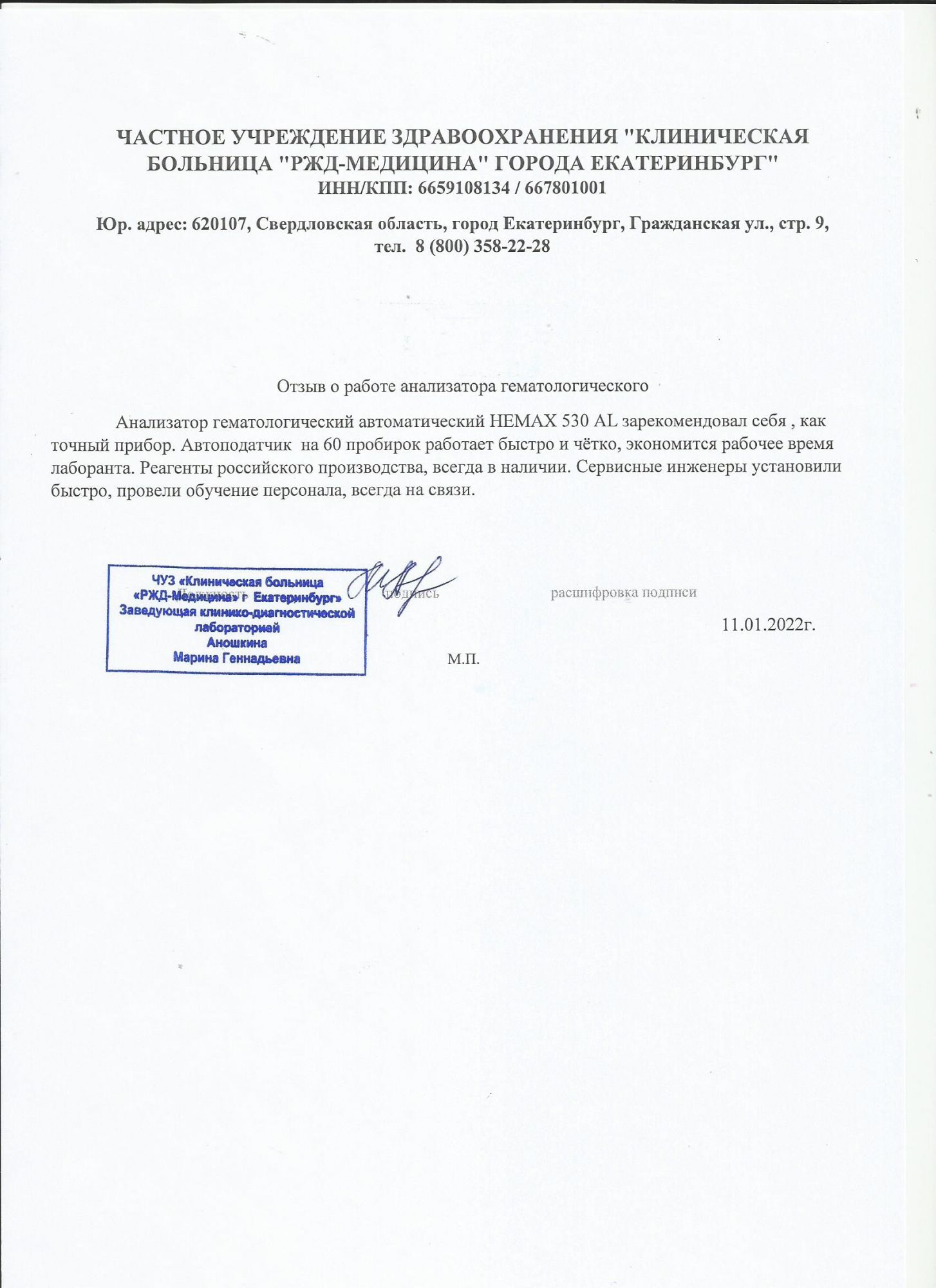 За время работы анализатор зарекомендовал себя, как надежный и простой в эксплуатации прибор. Сбоев в работе прибора не наблюдалось. Показаниями получаемых результатов довольны, отвечают требованиям лаборатории, предъявляемым к гематологическому анализу.