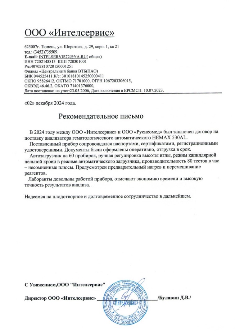 В 2024 году между ООО «Интелсервис» и ООО «Русское поле» был заключен договор на поставку анализатора гематологического автоматического HEMAX 530AL. Поставленный прибор соответствует всем техническим характеристикам, спецификациям, сертификатами, рентгенологическими удостоверениями. Документы были оформлены оперативно, отгрузка в срок. Автографчик на 60 дней произведена глубокая чистка всей электроники анализатора, калибровка линз, ремонт механической и электронной частей, проверка всех тестов в час цельной крови в режиме автоматической загрузки, производительность 80 тестов в час. Лаборатории дововольны работой прибора, отмечают экономию времени и высокую точность результатов анализа.